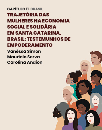 El capítulo once lleva por título «Trajetória das mulheres na Economia Social e Solidária em Santa Catarina, Brasil: testemunhos de empoderamento» realizado por Vanêssa Simon, Maurício Serva y Carolina Andion. O presente artigo pretende, por meio da análise de histórias de vida de participantes da Economia Social e Solidária (ESS) do estado de Santa Catarina (Brasil), discutir sobre o empoderamento feminino nesse setor. Essa articulação se faz relevante, pois a ESS se fundamenta nos princípios da cooperação, igualdade e solidariedade, apresentandose, portanto, como um espaço promissor para atuação das mulheres, principalmente para aquelas que vivenciam situações de vulnerabilidades.