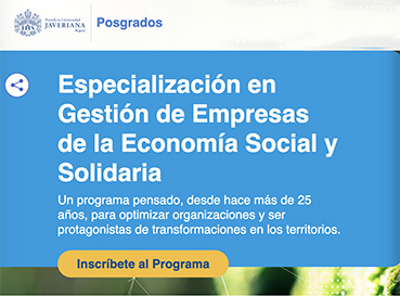 La Especialización en Gestión de Empresas de la Economía Social y Solidaria es el nuevo programa de formación a nivel de postgrados, en modalidad 100% virtual, que ofrece la Facultad de Estudios Ambientales y Rurales de la Pontificia Universidad Javeriana. Tiene como antecesor la Especialización en Gestión de Empresas del Sector Solidario, que estuvo vinculada a la Facultad de Ciencias Económicas y Administrativas entre los años 1995 y 2009.
